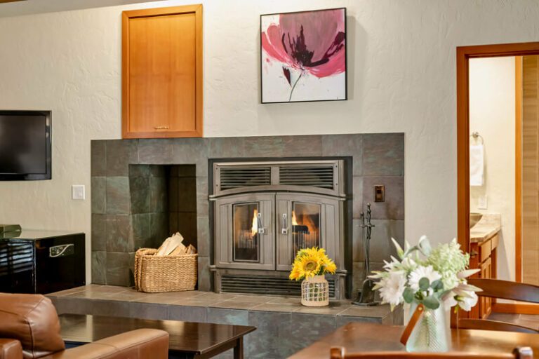 There’s plenty of room to relax inside on your California King or out on your private deck. The large bathroom features a soaking tub and radiant heated floors. Relax after a long day in front of your own fireplace. Portable window air conditioning unit available for this room.